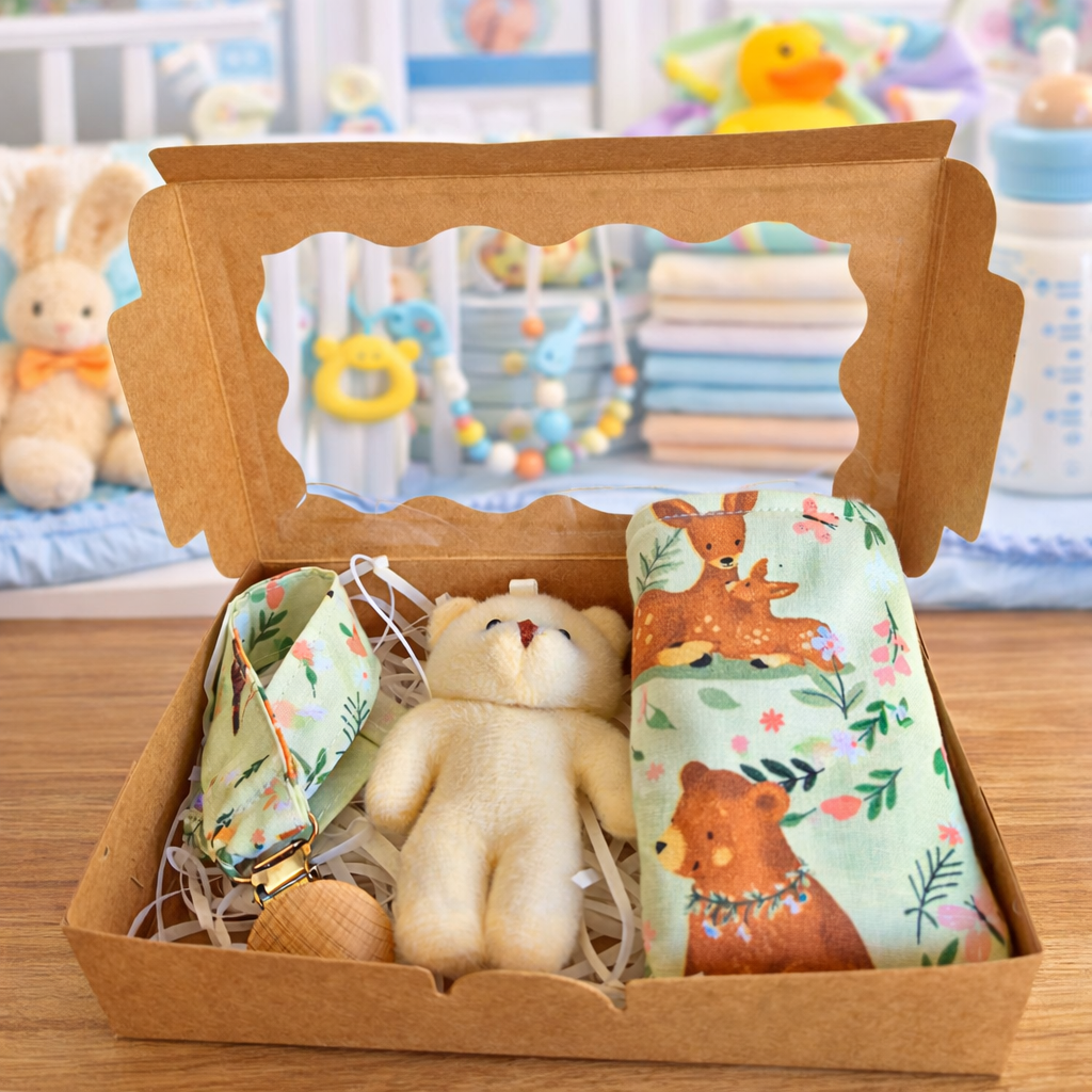 This charming Forest Animal gift box is a beautiful choice for welcoming a new baby. Carefully curated and handmade with love, it includes a forest animal–themed dummy clip, a soft burp cloth, and an adorable teddy bear, all presented in a lovely gift box.